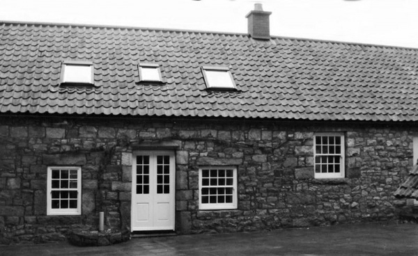 Above the accolade of the third window is an incised cross. To the left of the doorway, which is offset to the right of the second window on the first floor, is a narrow additional window with plain reveals. The front door is straight lintelled, without a chamfer, inscribed 1692 ILR MLB.
