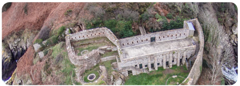 L'Etacquerel Fort was built in 1836 on a headland on the east side of Bouley Bay - the site fortified since the 18th century. A battery was built nearby between 1786-90 - to which was added a powder magazine in 1807. Essentially a gun battery with the addition of a guardhouse and flanking screen walls with loopholes to defend the positions from attack on the sides facing inland.