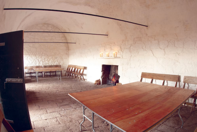 The walls are granite with dressed stone openings, steps and walkways. The arched vaults are in brick. There are granite flagged floors and dressed granite fireplaces in the barrack rooms. The original doors and windows have been lost but an iron grille survives in the storeroom.