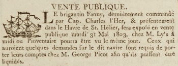 Charles L'Her was the master of the brigantine Fanny which was advertised for sale in the Gazette de l'Ile de Jersey in 1803