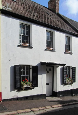 Two storey plus attic, three bays. Tile roof, brick end stack. Render coping.