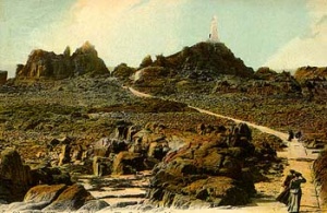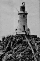 - "On St Catherine's Day, 1495, five Spanish caravels were driven on these rocks, and the sand-storm which destroyed the fertility of Les Quennevais was attributed by tradition to God's wrath at the cruelty shown to their crews, And so the dismal tale went on throughout the ages. At last, in 1873, a lighthouse was built by the States. Imrie Bell, the engineer, chose an isolated rock 500 yards from the shore. On this he placed a concrete platform 9 feet high, and a tower 35 feet high on the top of that, the first lighthouse in the British Isles to be built of concrete. The light, which is now electric, can be seen for 18 miles.