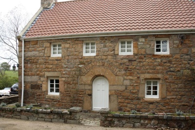 - "This house fell into disrepair shortly after the war and remained empty for years, slowly deteriorating, until little was left but the gable ends and the round arch, although much of the old stonework remained lying where it fell. It was bought in 1961 and has been completely restored and much enlarged.