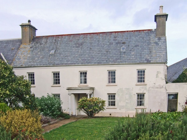 Main house: 2 storey, 5 bay. Front (south) elevation: slate roof with rendered chimneys. Painted render with ashlar effect. Timber porch with Ionic pillars and dentilled cornice. Windows 12 pane (6/6) timber sashes without horns.
