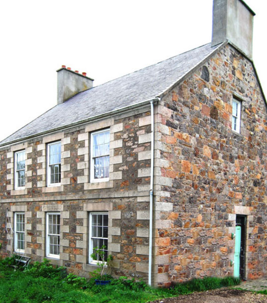- ↑ As can be seen in the photograph this three-bay granite house is unusual in that there is no entrance in the front facade. This does not appear to be the original layout, because why would the datestone be a lintel over the centre ground-floor window? It looks as if the front door was replaced with a window at some point in the property's history, with access now in the side gable