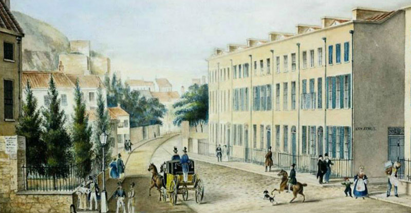 Before the street was developed, the north side consisted of open fields belonging to Manoir de Tehi and the south side belonged to Colomberie House on nearby Colomberie. In 1798 a large tract of land belonging to the Manoir's owner, Jean Brohier, was acquired by Jacques Hemery Additional fields were purchased from Thomas Pipon and Charles William Le Geyt and Jacques Hemery built a row of seven town houses, as homes for his late brother's six sons and one daughter.