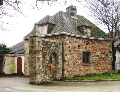 The Gatehouse: An unusual example of a gatehouse located in a prominent location at the entrance to La Moye Manor. Circa early 20th century, incorporating fragments of earlier structures. Small single storey gatehouse, archway and gate pillars.