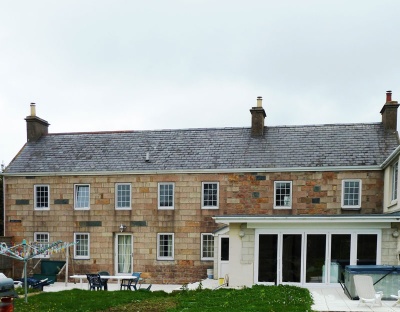 Two storey, four-bay main house with two-bay wing to east. Returning south from east corner is a 20th century two-storey wing. To the north are assorted outbuildings.