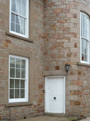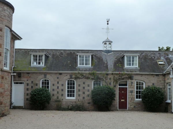 Former mid-19th century outbuildings - part of a cohesive group, when viewed from the courtyard, each with its distinct character. Retains vernacular proportions and historic character including attractive red granite rubble walls of north building, and notable chequered grey and black ashlar stonework on west building.