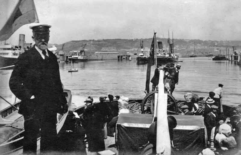 These two photographs, supposedly of the same vessel, came to us captioned 'Southampton'. However, the only ss Southampton which operated to St Helier, where the picture below was undoubtedly taken, was a paddle steamer which was in service from 1860 until 1897, and was broken up the following year. The lower picture, which purports to show the Master of the vessel, appears to have been taken some 14 years after that. The clothing in the upper photograph would also seem to suggest the Edwardian era rather than Victorian. We asked Kevin Le Scelleur, an authority on steamships, if he had any suggestions, and he expressed the view that the Master is standing at the top right of the upper picture. He cannot explain why the lifeboat has the name 'Southampton' on it. As far as the lower picture is concerned, he said: "The other picture is very interesting. I think it is the 2nd Mate standing up, and the vessel is Laura at right angles to the Victoria Pier, swinging to berth at the west cross berth. The interesting bit is the vessels in the background. The three boats in the middle of the harbour are I think GWR Roebuck with a tug on the left side and a salvage vessel on the right. This is after her grounding on the Kaines under La Moye, and if this is correct the picture was taken on either 14 August 1911 when she was towed into the Harbour, or on 19 August when she left for Milford Haven. This also ties in with the rock breaking platform in the upper part of the Harbour."