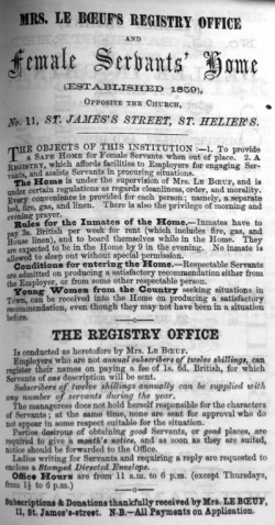 Finding servants for affluent Jersey families was big business in the 19th century and one of the main agencies was run by Mrs Le Boeuf in St James' Street in the 1850s to '70s. One of her almanac advertisements promoted 'A privateroom for the use of Ladies, in which they can meet the required class of servants at an appointed hour'.