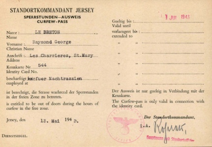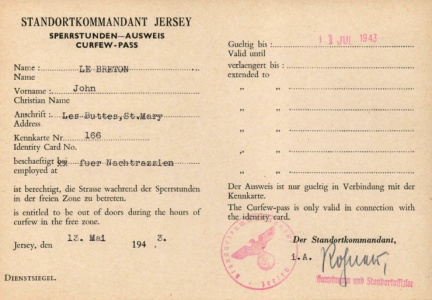 Curfew passes issued to Francis, John, John Hedley and Raymond Le Breton during the Occupation as members of the Honorary Police [2]