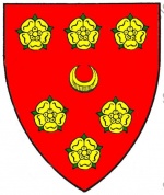 As borne by Matthew Le Gallais: Gules, a crescent, between six roses, or, three in chief and three in base.