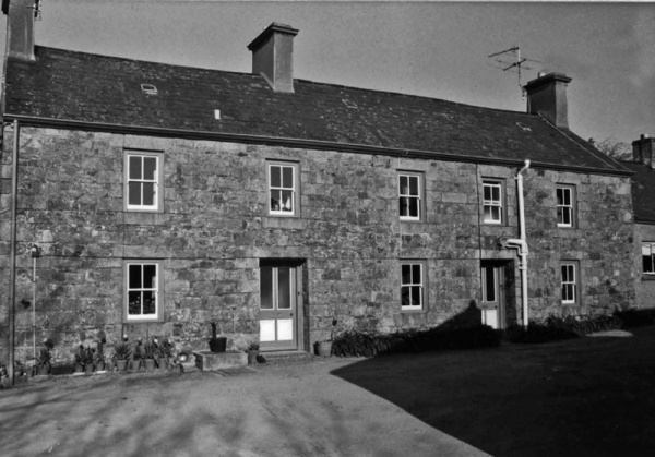 Two-storey five-bay house with two-bay wing to east; outbuilding to west; barns to east and south east. Across road are a barn and pigsties.