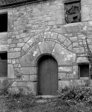 The gatehouse - built as one piece with the double-gateway in 1643 - is a very interesting structure and a rare survival of its type. The double-arched entrance archway is of well-dressed granite, with shouldered springers and large upright base blocks. The outer openings are embellished with a moulding comprising a three-quarters roll and sunk chamfer. There is a large archway for vehicular access and an adjoining pedestrian archway. The perforated stone corbels for the gates survive in situ. The pedestrian arch is now incorporated into the 19th century extension to the cottage.