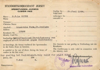 Curfew pass issued to S E Le Riche during the Occupation as a member of the St Brelade Honorary Police [1]