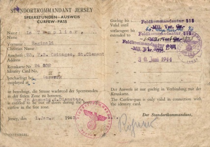 Curfew pass issued to Reginald Le Templier during the Occupation as a member of the St Clement Honorary Police [1]