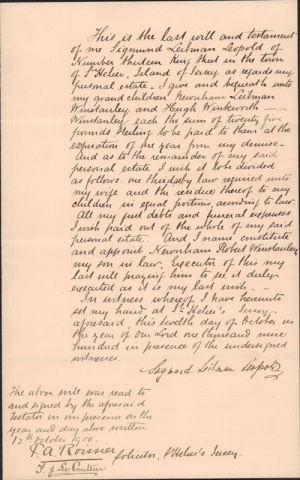 These wills created by members of the Leopold family are now held by Jersey Archive. By visiting the archive site and using the names, dates and reference numbers shown here, it is possible to view a copy of each will. You will have to subscribe to the Archive's online service to do this. To find out more about this collection, which covers the period from 1663 to 1980, and how to search for your family's wills there, visit our Jersey wills page