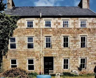 Five-bay, three-storey house with outbuilding range, and restored pigsty, adjoining to west. House has slate roof with pair of dressed granite chimneys.