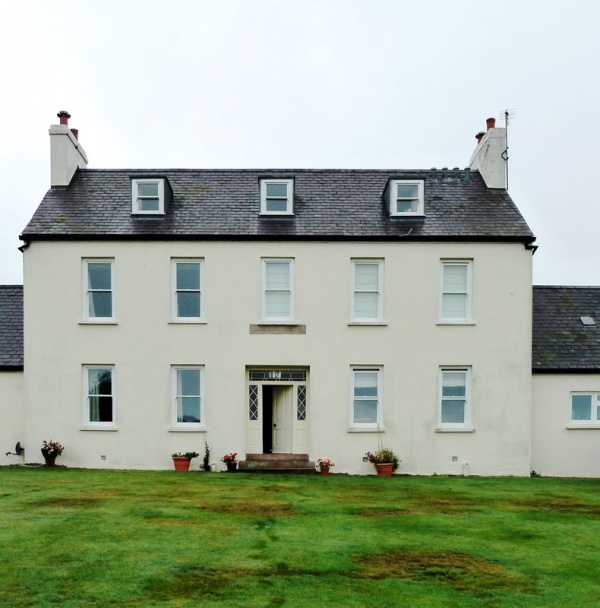 Main farmhouse (two-storey with attic, five-bay) with lower wings to north and south; Two-storey outbuilding range adjoining to north; and pigsties enclosing the yard to the north. The main house has a slate roof with rendered chimneys on each gable.