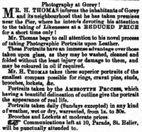 1859 advert for H Thomas, who is shown to be operating at Gorey at that time, as well as receiving orders at 10 Parade, where the advert above shows E R Cook in business