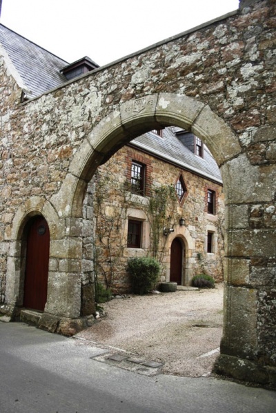 Linking the properties along the roadside is a tall granite wall containing a double entrance arch (carriage and pedestrian) accessing a shared courtyard. Another single arch is at the south end of the garden, inscribed 1664.