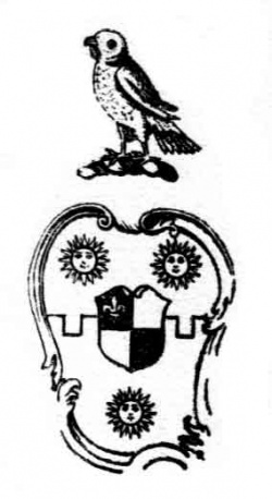 The Visitation of 1665, above the pedigree quoted above, states "Arms-Per fess embattled gules and azure, three suns in splendour or, a canton argent. No proofe made of these arms".