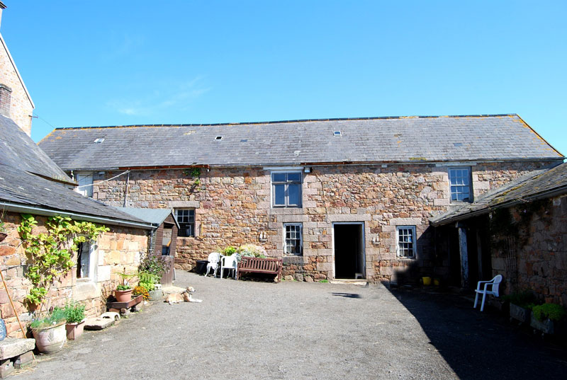 Flanking this building is a granite pigsty and a small single-storey building - reputedly used for storing vraic. At the centre of the farm group is a two-storey granite building containing a cider house and stable, and incorporating architectural fragments from earlier buildings. Of particular note on the north elevation is a small chamfered first floor arched head window - possibly a re-used medieval benitier - and an external flight of granite steps with a curious pair of integral rabbit hutches.