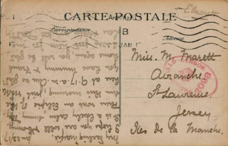 Postcards sent to his daughter Marjorie by Captain Elie Philippe Marett, a doctor who was serving with the RAMC, in January and February 1917. Marjorie was 14 at the time and living at Avranche, St Lawrence, with her mother Edith, her father's second wife, and her seven-year-old brother Francis. The family home, Avranches, popularly but incorrectly known as Avranches Manor, was spelt with a final 's', like the French town it was named after. It is strange that Capt Marett used the spelling seen on the cards