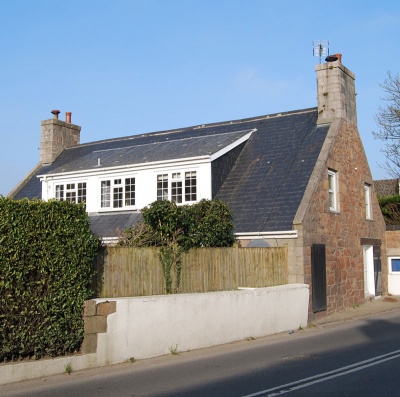 Five-bay single-storey cottage in corner location on junction of Rue des Servais and Grande Route de St Jean.