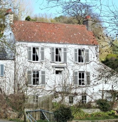 This mid-19th century, three-bay house has added grandeur with its raised ground floor level. It retains historic features and contributes to its rural hillside setting.