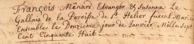 Francois Menard married Susanne Le Gallais in St Helier in 1758
