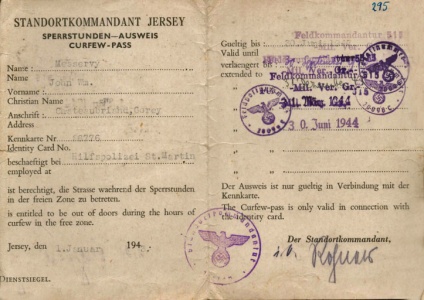Curfew pass issued to John Messervy during the Occupation as a member of the St Martin Honorary Police [1]