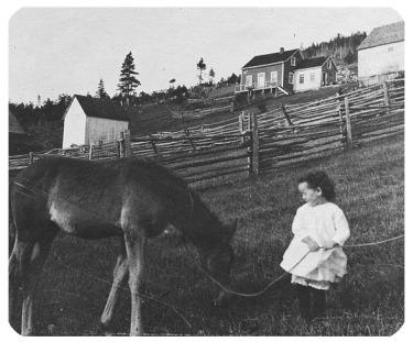 May Minchinton at Gaspé, Canada. This picture, which is part of the collection of the Musee de la Gaspesie, has a caption indicating that it was taken in about 1882 and that her family was of Jersey origin. However, our main Minchinton family tree shows that Francis Samuel Minchinton arrived in Gaspe in 1870 and there were no female children born to him and his wife Susanna Jane Russell early enough to be May. It has now been established that the date given to the picture is wrong and that the May in the photograph is Mildred May Minchinton, the illegitimate daughter of Francis and Susanna's daughter Maud Mary, who died at the age of 20, four months after the birth of Mildred May in 1911. The property in the background is said to belong to George Langlois. Maud Mary's sister Mary Jane and her brother Alfred married into the Langlois family.