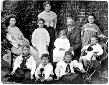 Joseph McFarlane Mitchell and Mary, nee Barfield, with the first eight of their ten children in Portsmouth in 1906: Cecil Oscar, Rose Ann, John Leonard, Mary Lilian Grace, Eileen Margaret, Mabel Florence, Bernard Vincent and Patrick Francis. Mary Lilian was born in Grouville, Jersey. All her children were born in Devon or Hampshire