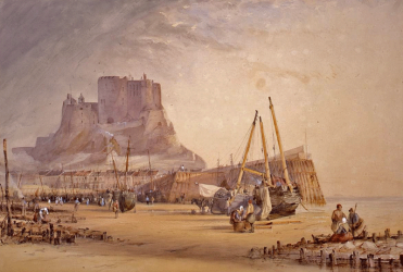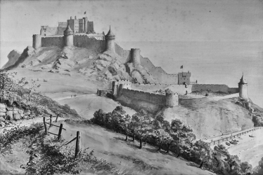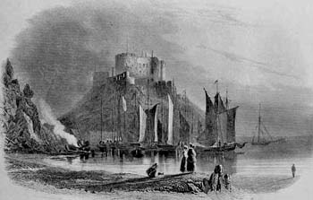 This engraving of Mont Orgueil Castle is taken from a three-volume 1840 historical novel, The Fortress: An historical tale, by Amelia Lane. The date of the engraving is not known, nor is its accuracy, but it shows the castle at a time when there was no pier, with a substantial stone staircase stretching from the shore to the castle.