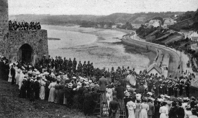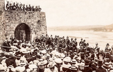 On receiving the news in 1907 that the castle was to be handed over, the Bailiff, William Venables Vernon, wrote to the Lieut-Governor, Major General , suggesting a ceremony to celebrate the occasion. The King’s birthday was chosen as a fitting day. The States assembled and with much pomp and circumstance, as shown on the pictures below, the keys were officially handed over. General Gough delivered a speech to mark the historic moment.