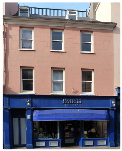 Early-mid 19th century building which retains its original character externally and to some extent internally. Three-storey with attic. three-bay. Slate roof with two small box dormers. Original gutter tray and fascia. Ground floor shop front and flat entrance defined by ionic pilasters. First floor, front office retains original fire surround with adjacent sideboards. Stair to first floor stores original, simple stair with (some) stick balusters. Original floorboards. Cellar has two fluted iron columns supporting floor over.