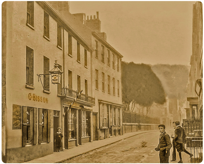 A picture taken between 1897 and 1900. Charles and Ada Bisson acquired No 14 in about 1892-95 and established the Bond Hotel. Previously Amice de Carteret had been shown in almanac street directories as running the Birmingham Hotel at Nos 14 and 15. He appears in several registers of licenced suppliers of alcohol from 1885 to 1889. The entries relate to No 14 Bond Street, and it is clear from census listings that the hotel only occupied No 14. These two properties appear to have been constructed as one six-bay frontage and in this picture the Bond Hotel occupies three bays on the left and then there is a shopfront on the three right bays. In the 21st century the Bond, still in business as a public house, occupies four bays and there is only a two-bay shopfront. There is what appears to be a barber's pole outside the shopfront and the 1891 census confirms that No 14½ was the premises of hairdresser James Webb, and that the shop at No 15 was Jules Anne's and his wife Maria's grocery. A 1895 almanac shows Charles Bisson at No 14, L P Maloret at 14½ and A de Carteret at 15. The following year's listing just shows C bisson at No 14 and R Enwright at No 15. This continues for several years, but it has not been possible to discover what business R Enwright was conducting here, or even if he was just occupying residential accommodation above a shop. The 1901 census offers no guidance because the only Enwright family living in St Helier was that of Richard and Emma Enwright, in Colomberie. Richard was a gardener and his wife a greengrocer, working from their home