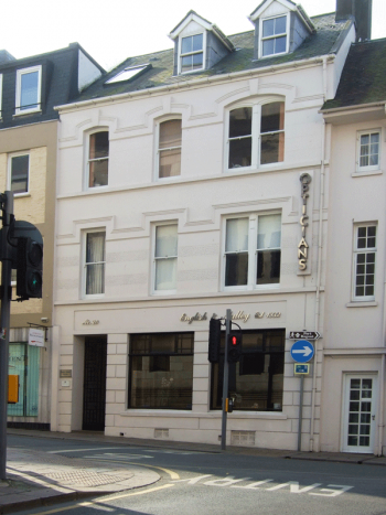 Mid terrace, three-storey, three-bay. Front elevation: slate roof with two modern gabled dormers, and a rooflight. Painted render finish, with running hood-mould on window openings, bands of vermiculation and rusticated render shop front to street level. Ground level, a pair of 1950's timber windows and entrance. Upper floors have single pane timber sashes with horns, top floor windows are arched and windows of the west bay are paired together in a single opening on both levels.