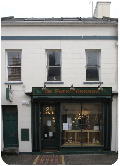 De Faye's Chemist. Previously had three carved coats of arms 'By Appointment' above the fascia - the arms of Princess Christian of Schleswig-Holstein; Queen Alexandria; and Queen Mary; all awarded for the supply of Jersey-made Eau de Cologne.