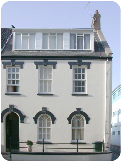 Part of a row of four houses built for John Oxenham, 1819-1821 (originally numbered 1-4 Devonshire Place, from which the northerly part of Vieux Chemin since took its name). Shown on the 1834 Le Gros Map.