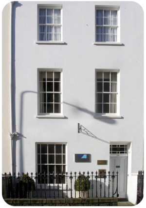 This house has been used as a medical practice for doctors, dentists, chemists and veterinary surgeons. Mid-terrace set back from road. Two-bay, three-storey. Front elevation: Slate roof, small box dormer with original six-pane sash window. Ashlar effect stucco. First and second floor windows are 12-pane timber sash without horns. Ground floor sash window has narrower panes at side. Door is two-panel timber, overlight with coloured glass margin lights. Original door number on moulding above door. Stone boundary wall, granite coping, iron railings and gate.