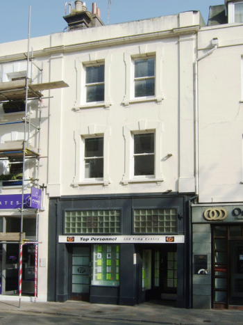 Mid-terrace, three-storey, two-bay. Front elevation: roof sits behind a parapet. Painted plain render finish with parapet moulding, raised shouldered, eared window hoods, all is framed between plain render pilasters. At street level is a glazed shopfront, the upper floors have single pane timber sashes with horns.
