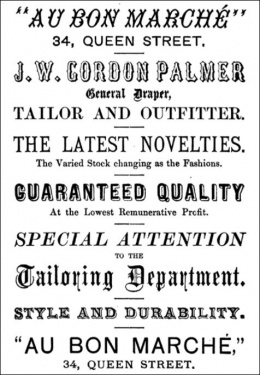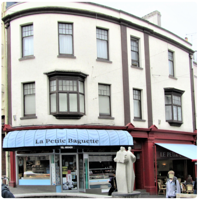 There is no record of No 34 in early censuses. Pork butcher John Cory was shown there in an 1874 almanac. The advert on the left indicates that tailor Gordon Palmer traded here as Au Bon Marche in 1881. He was followed by broker R D Plymen in 1896 and 1890, the Phoenix Club, about which little is known, in 1901. It was managed by Edward Jones (1836- ) and his wife Prudence (1865- ), both from England. It was followed in 1905 by Eastman's Ltd, from 1920 to 1940 by L Klein, then for 20 years by B A Fairbairn, and it is now Le Petit Cafe and La Petite Baguette.