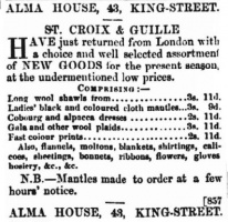 There was a gap between the two tobacconist businesses. Advertising shows that in 1857 the premises were known as Alma House and 'St Croix and Guille' were trading in ladies' clothing. This business appears to have been short-lived.
