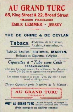 So, too, was Emile Lemmer (1869- ) and his wife Lucie (1873- ), who had taken over by 1904. He called his business Au Grand Turc, and it was aimed very much at French visitors, described as a Maison Francaise, and selling tea, Algerian tobacco, French newspapers, and accepting French currency without surcharge. After Emile's death in the 1910s, Lucie took over the business.