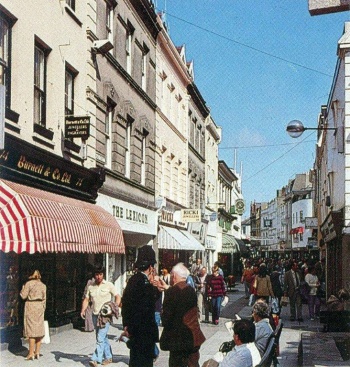 St Helier had no traffic-free streets until the late 1960s, when King Street became the first pedestrian precinct, followed soon after by Queen Street. Jersey Tourism took the opportunity to commission these photographs to illustrate promotional glossy brochures to promote conference business in the island. Many of the buildings at the bottom end of King Street shown in the photograph had remained relatively unchanged, at least externally, and particularly above the ground floors, since they were built in the 19th century.