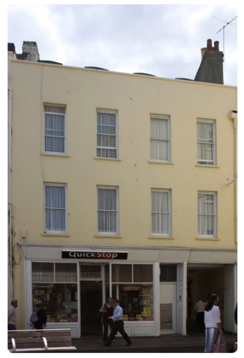 Listed building Early 19th century property contributing to character of the street. The site is of interest, being located within the lower end of the town which developed from the 15th century; location of 15th century sea wall and 17th century prison. Three-storey, four-bay mid terrace on to road. Front elevation: Roof set behind rendered parapet. Ground floor shop front in three bays and alley through to rear in westernmost bay. Edwardian shop front has been largely altered, but retains leaded light top panels. Door set in a panelled reveal is new with vents above. To the right of this door is a pair of large vehicular access doors opening onto the passage into St Andrews Yard to the rear. They appear to date from around 1900.