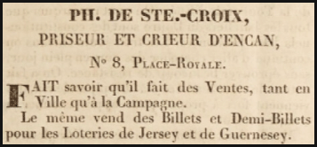 In this 1833 advert in L'Impartial, auctioneer Philip de Ste Croix, gave No 8 as his address. He was also an agent for Jersey and Guernsey lottery tickets